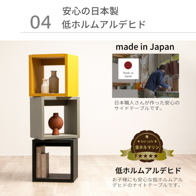 シンプルでおしゃれなデザインが特徴で、イエロー、グレー、ブラックの3色から選べます。頑丈な仕様で、完成品としてお届けしますので、すぐにお使いいただけます。高品質なこのナイトテーブルは、どんなインテリアにも調和し、空間をスタイリッシュに演出します。「PALM LOOP」ベッドサイドテーブルは、地球温暖化防止に貢献する廃材再利用の日本製品です。源ベッドの1年保証付きで安心。