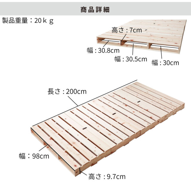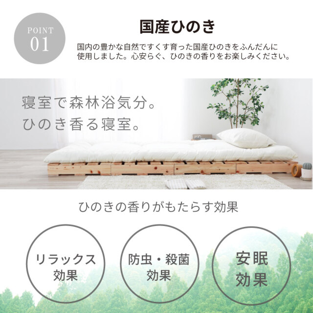 - ひのき材(島根県・高知県産)、無塗装、集成材、一部合板(すのこ板間隙間約10~13mm)